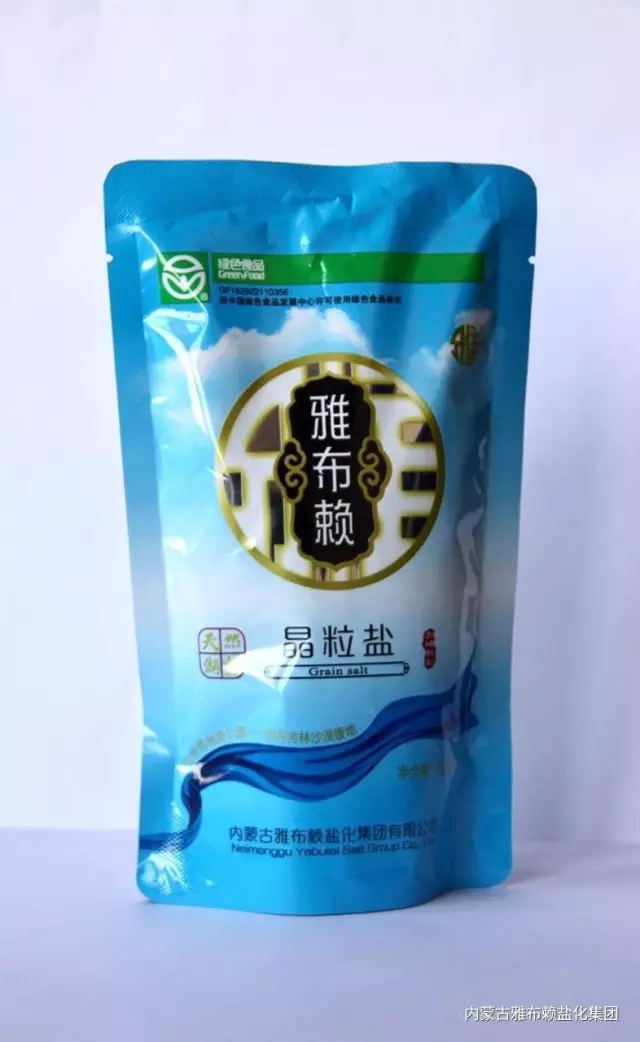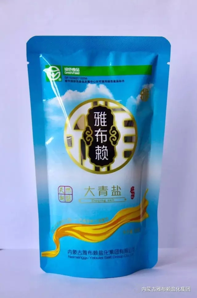 雅布赖天然湖盐之“大青盐”,选用聚天地之精华的万年原生大粒盐根为原料,在保持原有微量元素不变的基础上,精选加工而成,富含天然钙、镁、氨基酸等微量元素,无任何添加剂,具有口味纯正的特点,食用后有泻热、凉血、明目、润燥之功效;适用煎炒、腌渍食用,特别是中老年人、婴幼儿、孕妇等人群的首选产品。袋面下方黄色哈达象征孕育万物的大地,是大漠戈壁对世人最好的馈赠,也是雅布赖人给您最珍贵的礼物。